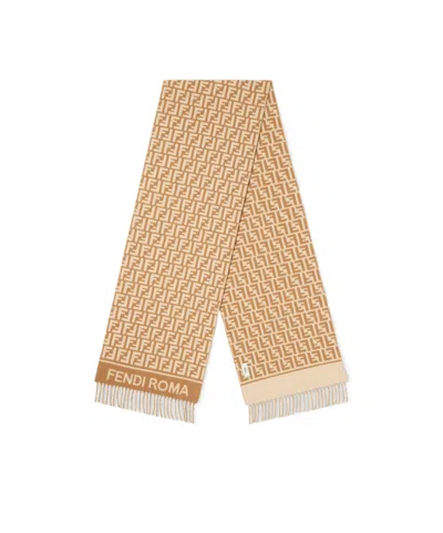 Product details drop up--btn Scarf made of wool and cashmere yarn with an all-over camel jacquard FF motif Embellished with Fendi Roma logo and fringes on the ends Made in Italy Composition 80 wool 20 cashmere Materials Size worn null The model is null tall Model height null Size worn null Measurements Height 190 cm Width 30 cm Product Code FXT113AQCWF0QB8 Sustainability FENDI AT YOUR SERVICE drop up--btn shipping returns Shipping and Returns Complimentary shipping on all orders Free returns within 14 days online or in store Free exchange in store calendar Book An Appointment Get in touch for an in-store or virtual appointment store In-store Pickup The best of both worlds shop online and pick up your order at your convenience in selected Fendi stores gift Gifting Your order will be elegantly wrapped in our signature Fendi package Add a personal message to send an exclusive gift