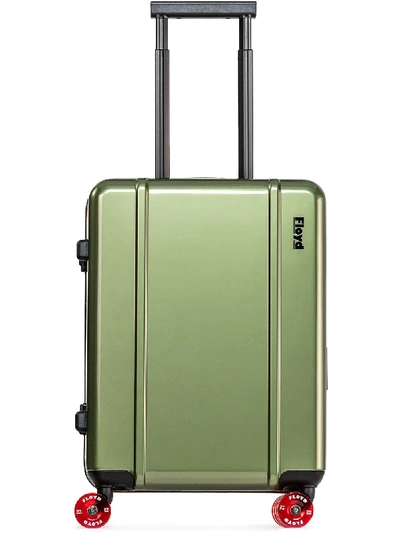 Green Vergas check-in travel case from Floyd featuring logo print to the front, all-around zip fastening, multiple interior compartments, high-end hard shell polycarbonate, durable expandable aluminium handle, sticker set, bag cover and size: 700 mm x 450 mm x 250 mm (Height x Width x Depth).