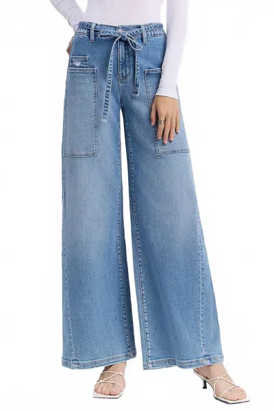 FLYING MONKEY High Rise Elastic Tie Waistband Baggy Wide Jeans In Clinquant In Blue