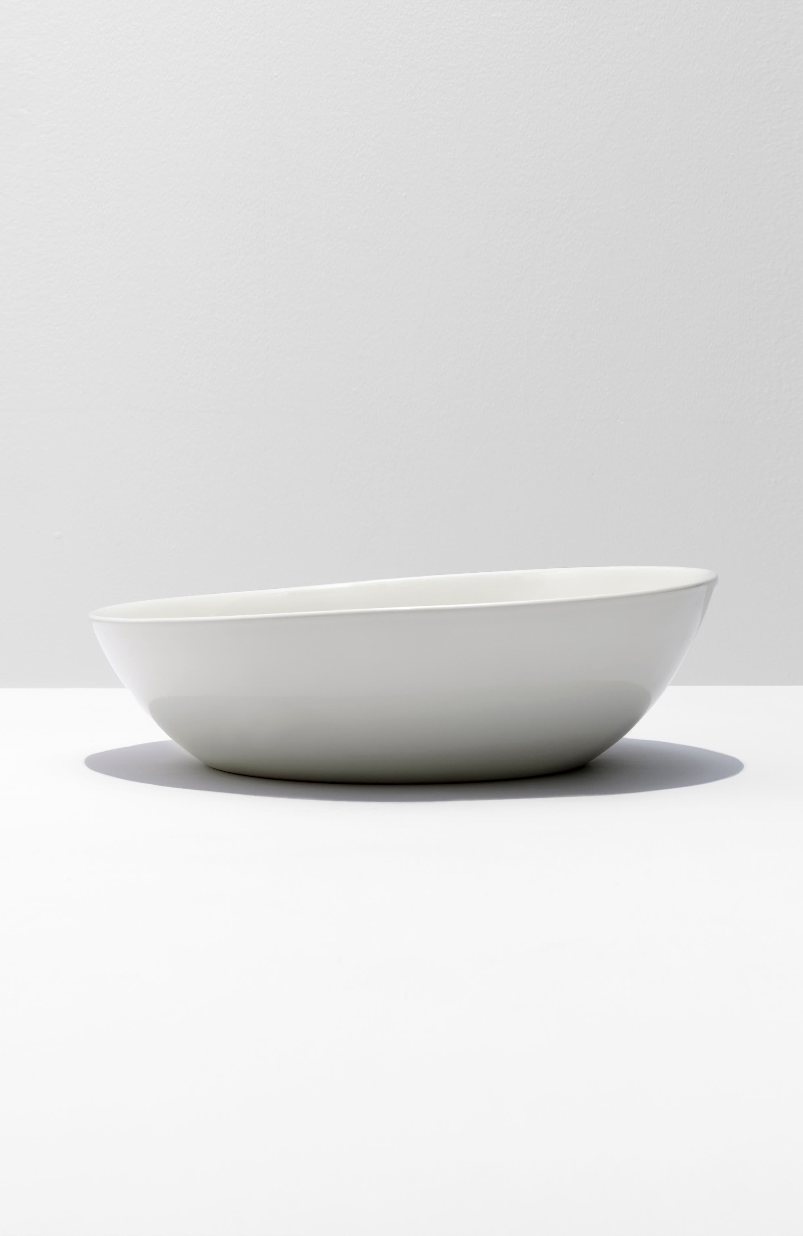 Asymmetrical with curved walls, the førs slanted serving bowl allows for easy serving and shared use, perfect to pass around the table. Designed as a nesting set, the shallow, complementary slanted and deep serving bowls stack into a sculpture of 3. Made with partially recycled clay Hand glazed Non toxic Chip resistant Hospitality grade Dishwasher, microwave, freezer and oven safe (up to 475 F)