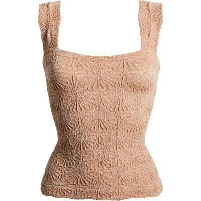 A raised floral pattern brings texture to a knit cami topped with scalloped straps. 18 1/2" length (size Medium/Large) Square neck 47% nylon, 47% modal, 6% spandex Machine wash, dry flat Made in the USA