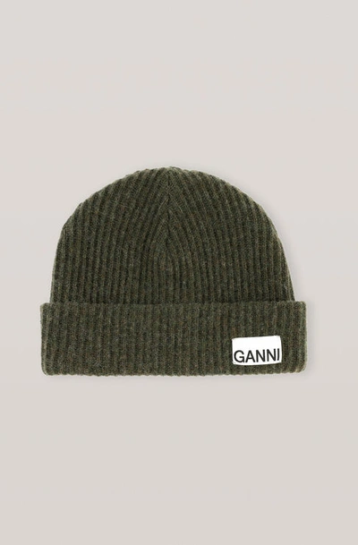 GANNI Logo-patch Recycled Wool-blend Beanie Hat In Green