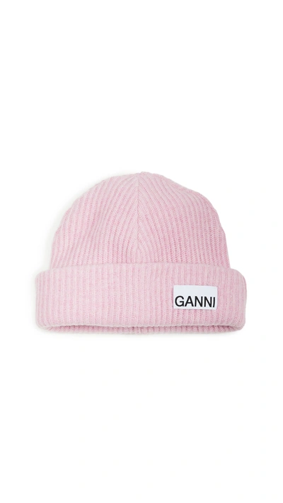 Pink recycled wool blend ribbed beanie hat from GANNI featuring turn-up brim and logo patch to the front. POSITIVELY CONSCIOUS: Ganni measures the carbon footprint of every item, and on each you'll find the Climate Compensated label, showing they've covered the cost to make that footprint carbon neutral.