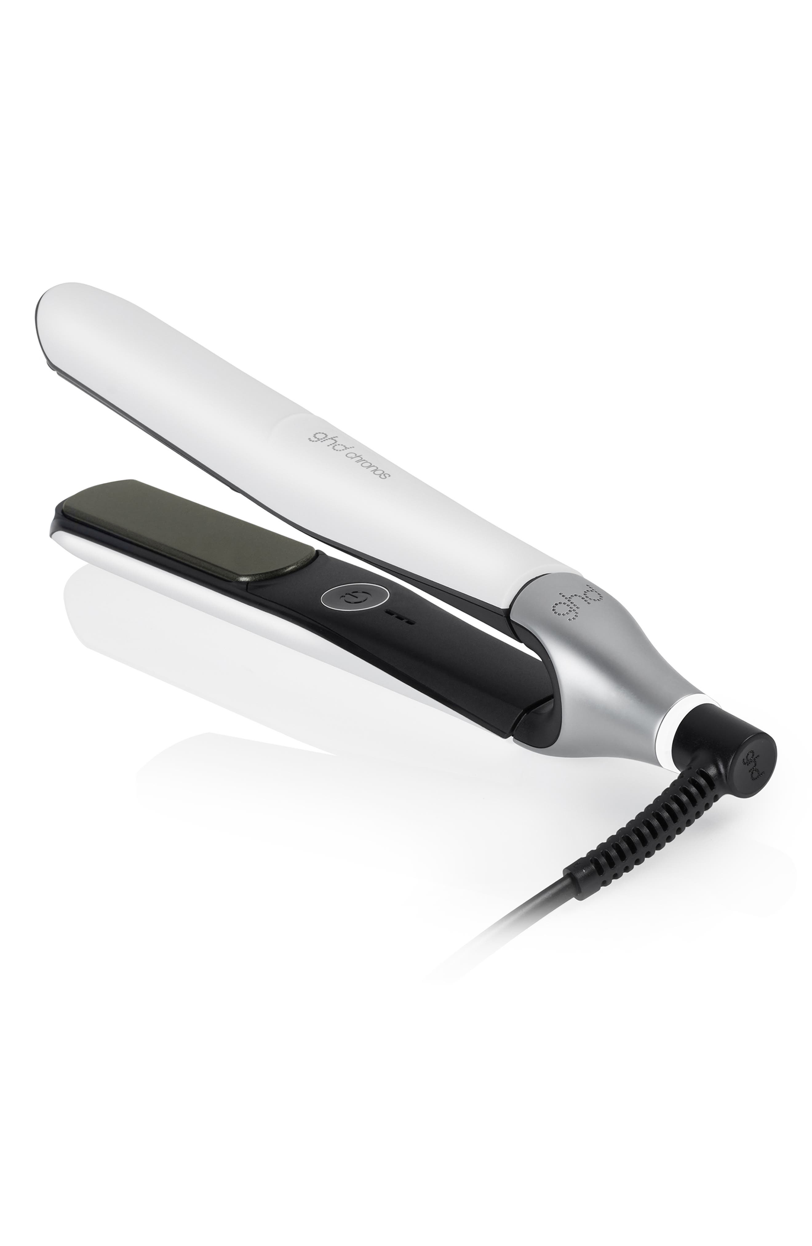 CHRONOS WHITE. Benefits: For up to 85% more shine, 2x less frizz, up to 3X more breakage protection and no extreme heat damage.***. Suitable for all hair types. Features: High-performance ceramic floating plates: coated with ultra-gloss for frizz-free, easy-glide styling. Re-engineered wishbone hinge: holds the plates in perfect alignment, giving you the ease and control you need to unleash your full creative versatility. Sleep mode: switches off if not used for 10 minutes. Universal voltage. Protective plate guard. Professional length 9ft cord. 3 year warranty. Disclaimers: *vs ghd original. Results measured by shine on brunette hair compared to naturally dried, lab test. **Consumer testing, Jan'22. 86% of 142 consumers agreed their hair lasted 24 hours after styling and 73% agreed ghd chronos created superior looks vs their current straightener. ***Extreme heat damage is a fractional wet tensile strength reduction per cycle above 0.005, measured over at least 100 cycles on brown Caucasian hair (a Strength Reduction). Technical test in a lab on brunette hair, measured vs. naturally dried hair. Technical test in a lab on frizzy hair, vs. naturally dried hair. Technical test in a lab vs. competitor styler working at 455F.