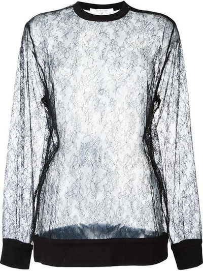 Black cotton lace blouse from Givenchy featuring a round neck, long sleeves and a straight hem. Spandex/Elastane 5% Polyamide 100% Cotton 95% Dry Clean Only