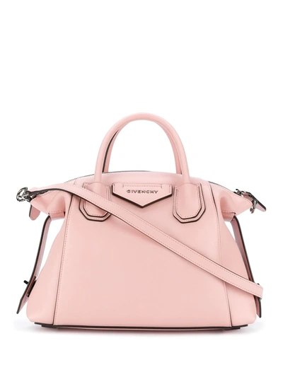 Givenchy Small Antigona Soft Bag in Pink Presenting the iconic 'ANTIGONA' reimagined by Matthew M. Williams. Blending his affinity for industrial hardware with Givenchy hallmarks to subtly infuse the Antigona's elegant geometric silhouette with a more voluminous design, a modern attitude, and a futuristic edge.. Calfskin leather with canvas lining and polished silver-tone hardware. Made in Italy. Measures approx 12W x 10H x 2.5D. Double leather top straps measures approx 16 in length with a 5 dropDetachable leather strap with logo debossed detail measures approx 44 in length. Two-way zip top closureInterior slip and card slot pockets. Triangular patch with GIVENCHY signature metal logo hardware on front. Double leather side bands with turn-lock fasteningBottom leather foot protectors. GIVE-WY803. BB50F3B11E. About the designer: Hubert de Givenchy founded his namesake fashion house specializing in Haute Couture and ready-to-wear in 1952. No sooner did it open than Givenchy earned a reputation for breaking with the fashion codes of its time. Today, the house is synonymous with aristocratic elegance, sensuality and fresh romanticism. Its legacy continues through the modern approach of its newest Creative Director Matthew M. Williams, appointed in June 2020.