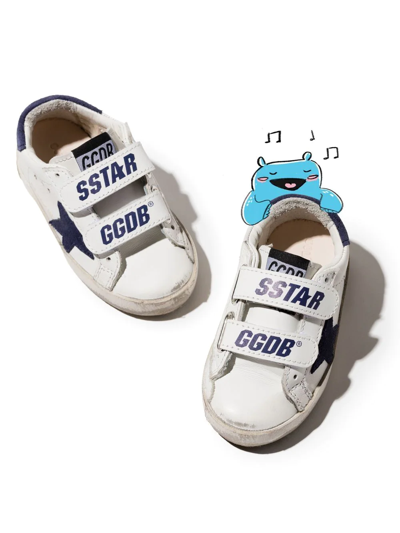 Old School low-top sneakers from Golden Goose Kids featuring white, navy blue, calf leather, suede, logo print to the front, signature star patch to the sides, round toe, front touch-strap fastening, logo patch at the tongue and flat rubber sole.