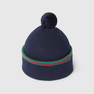 The archival Web stripe appears throughout the Cruise 2025 children's collection in a variety of iterations. Green and red trims across ready-to-wear, shoes and accessories create a sporty attitude, fit for every adventure. This children's cotton hat is enriched with a green and red Web detail and pom pom. Navy cotton, Pom pom, Web detail, Made in Italy