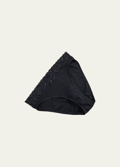 Hanro "Moments" briefs with scalloped Austrian lace trim Mid-rise sits high on the hips Wide waistband High-cut legs; flat satin edging Moderate seat coverage Cotton; lace, nylon/spandex Machine washable Made in Portugal