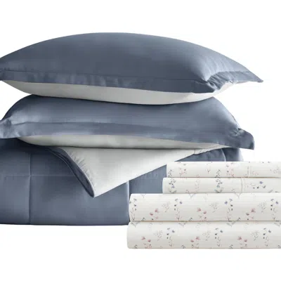 Reversible sides offer versatile styling of this comforter set that has a clean and simple design to bring modern decor to any room in your home. Includes comforter, one flat sheet, one fitted sheet, two reversible shams and two pillowcases<br type="_moz"> Lined, with synthetic fill 100% polyester Machine wash, tumble dry Imported