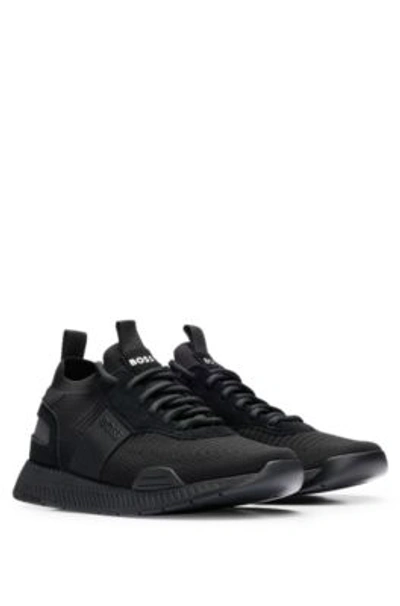 HUGO BOSS Knitted-upper Trainers With Branding And Suede Trims In Black
