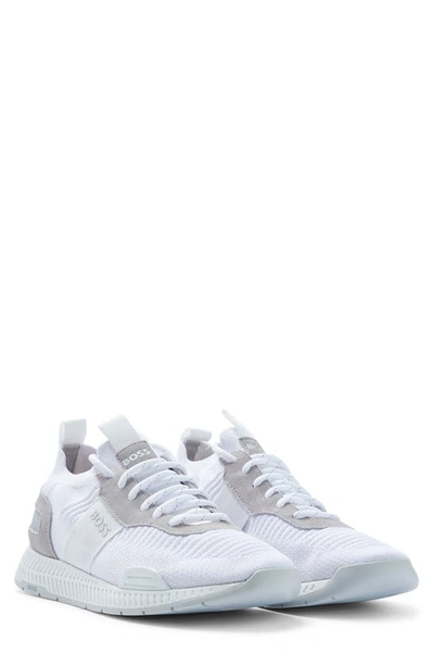 Sporty sock trainers by BOSS with bright white structured-knit uppers and elasticated webbing accents. Featuring subtle silver branding at the tongue, side panel and heal back, with light pale grey suede panelling throughout. This pair is partly made with REPREVE® fibres. REPREVE® is a leading branded fibre made from recycled materials including PET bottles. Billions of plastic bottles go into landfills every year, and REPREVE® transforms them in yarns for a better tomorrow. * **Upper Material:** 80% Polyester (recycled), 20% Polyester * **Sole:** 70% Ethylene Vinyl Acetate, 30% Rubber * **Innersole:** 50% Cotton, 50% Viscose * **Product ID:** 50498245 100 HUGO BOSS is one of the leading companies within the premium segment of the global apparel market. Defined as the company's core brand, BOSS by HUGO BOSS features refined leisure collections including modern styles for customers who value quality, elegance, and first class service.