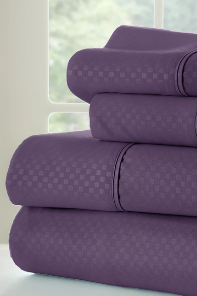 The Hotel Collection Embossed 4-Piece sheet set by ienjoy Home is designed with your comfort in mind. Add a designer accent to your bedroom decor with this timeless checkered pattern artistically created to be a wonderful addition to any bedroom. Made of the finest imported double-brushed microfiber yarns creating a new standard in softness and breathability, this 4-piece sheet set will make it incredibly hard to get out of bed in the morning. Our premium yarns are two times more durable than cotton, completely wrinkle free, and perfect for all seasons. Fits a California King Sized Bed. Color: Purple. ImportedSet Includes:. 1 Fitted Sheet: 72" W x 84" L. 1 Flat Sheet: 108" W x 102" L. 2 Pillowcases: 20" W x 40" LOrders cannot be shipped to Canada, Puerto Rico, APO, FPO or P.O. Boxes.