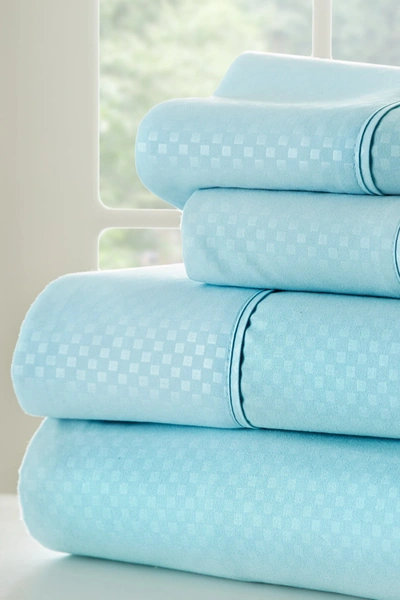 The Hotel Collection Embossed 4-Piece sheet set by ienjoy Home is designed with your comfort in mind. Add a designer accent to your bedroom decor with this timeless checkered pattern artistically created to be a wonderful addition to any bedroom. Made of the finest imported double-brushed microfiber yarns creating a new standard in softness and breathability, this 4-piece sheet set will make it incredibly hard to get out of bed in the morning. Our premium yarns are two times more durable than cotton, completely wrinkle free, and perfect for all seasons. Fits a Twin Sized Bed. Color: Aqua. ImportedSet Includes:. 1 Fitted Sheet: 39" W x 75". 1 Flat Sheet: 66" W x 96" L. 1 Standard Pillowcase: 20" W x 30" LOrders cannot be shipped to Canada, Puerto Rico, APO, FPO or P.O. Boxes.