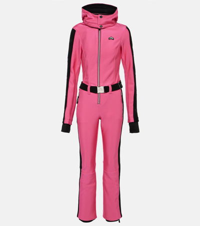 Prepare to turn heads on the slopes with Jet Set's pink Magic Ghoster ski suit. Crafted in Italy for warmth and convenience, it features fleece inserts, a front zip, detachable hood, belt, and leg zip adjustment.