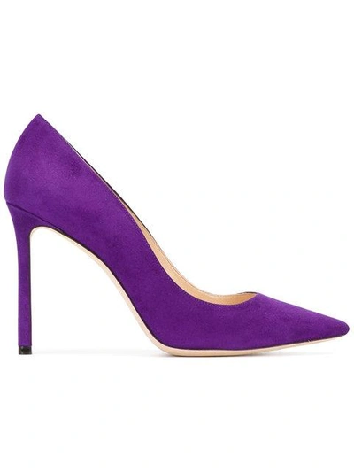 Iris purple suede Romy 100 pumps from Jimmy Choo featuring a pointed toe, a high stiletto heel, a branded insole and a leather sole. Leather 100% Leather 100% Suede 100%
