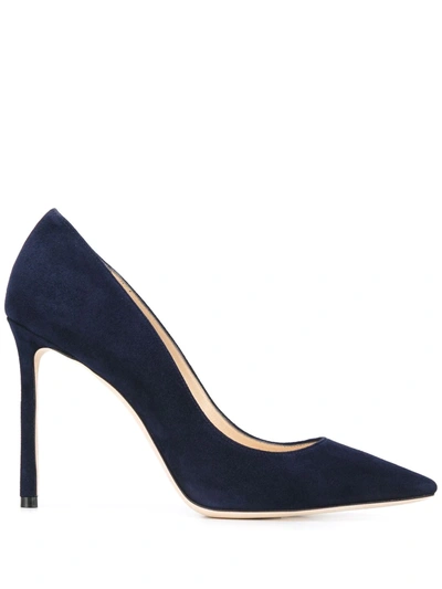 Classic and sultry, these navy goat suede Romy 100 pumps from Jimmy Choo are a wardrobe staple. These signature pumps have a subtlety pointed almond toe and slim delicate new style heel that is less severe, for true ladylike elegance. Featuring a pointed toe, a branded insole, a high stiletto heel and a leather sole.