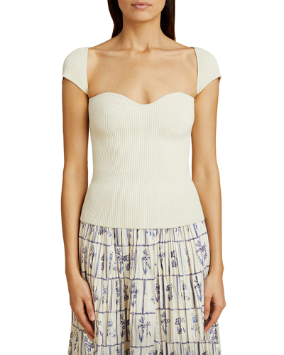 Khaite "Ista" sweater top in stretch matte viscose with directional ribbing. Sweetheart neckline. Cap sleeves. Slim fit. Pullover style. Viscose. Made in Italy.