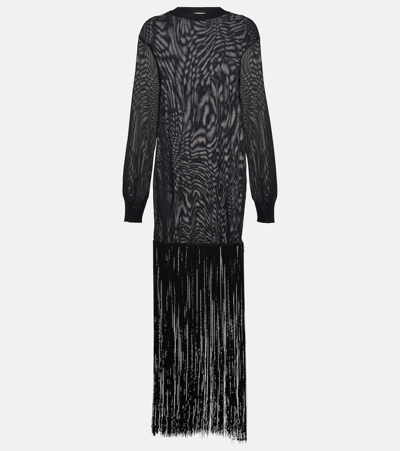 From lace-adorned slip dresses to sculpted leather pieces and minimalist knits, Khaite's collection reimagines eveningwear, taking notes from '80s and '90s glamour. Creative Director Catherine Holstein juxtaposes structured separates with pleated and sheer-paneled dresses and skirts. A hand-painted lip print lends an element of whimsy to this array, redefining sensual elegance with an irreverently New York attitude. Boasting mixed-media styling, Khaite's long-sleeve Maxi-length Torino dress offers a semi-sheer bodice and complementary fringe skirt. Banded ribbed crewneck Drop shoulders Long sleeves Pulls over 94% viscose/6% polyamide Dry clean Made in Italy SIZE & FIT About 63" from shoulder to hem Model measurements: 5'10" tall Model is wearing a US size Small. Designer Lifestyle - Khaite > Khaite > Saks Fifth Avenue > Barneys. Khaite. Color: Black. Size: Large.