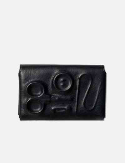 KHOKI The Object Card Case Made of cowhide Card case doubles as wallet Buttons, scissors, safety pins, and needles embedded into genuine leather Snap button closure Two compartment slots "K" embroidery Color: Black