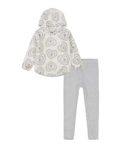 KIDS HEADQUARTERS Kids' Toddler And Little Girls Heart-print Oversized Sherpa Hoodie Ribbed Leggings, 2-piece Set In Egret,medium Gray Heather