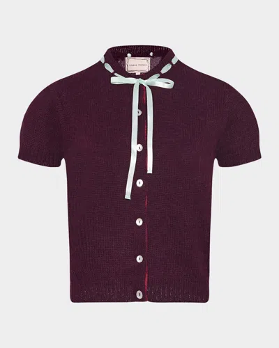 Spun from an alpaca-blend knit, the Brooke cardigan decorates its crewneck collar with a woven satin ribbon bow. Mother of pearl buttons and contrast rib trim create a clean finish. Mother of pearl button closure Satin ribbon bow (neckline) Contrast rib trim Knit 60% baby alpaca, 35% recycled polyamide, 5% wool Dry clean only Made in Peru Size & Fit Fits true to size Please note, below measurements reflect Lingua Franca's size chart, not the actual garment. Size XS: 31.5-33in bust, 24.5-26in waist, 34.5-36in hips Size S: 33-35in bust, 26-28in waist, 36-38in hips Size M: 35-37in bust, 28-30in waist, 38-40in hips Size L: 37-40in bust, 30-32.5in waist, 40-42.5in hips Size XL: 40-43in bust, 32.5-36in waist, 42.5-46in hips Lingua Franca Women's Brooke Satin Bow Short-Sleeve Wool Cardigan in Burgundy Wool/Polyamide/Baby Alpaca