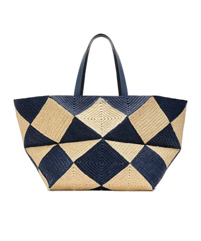 This spacious tote combines natural raffia with a refined geometric pattern in beige and navy, offering a sophisticated touch to your ensemble. Its clean, unlined design is complemented by leather handles and subtle metallic logo detailing, embodying understated elegance. Ideal for elevating everyday looks with a sense of effortless style. Generous size for versatile use Crafted from 100% raffia for a natural aesthetic Features leather top handles for durability and comfort Distinctive beige and navy diamond pattern with geometric panels Unlined design with metallic front logo for a polished finish | Loewe Men's Puzzle Fold Tote Xxl Natural/navy Raffia Bag in Beige | B779PFMX36NF Color 4910