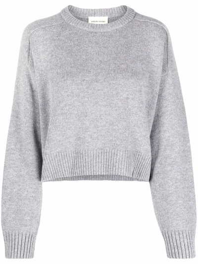 Long sleeve knit wool and cashmere-blend sweater in grey. Rib knit crewneck collar, cuffs, and hem. Tonal logo embroidered at front hem. Supplier color: Grey melange