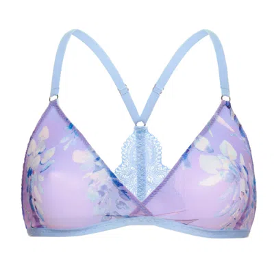 With a simple front design, Luciela's Sheer Wisteria Bralette is the perfect combination of sporty and sexy, whose halter neck lace back is ready to steal the show in a backless top. Unpadded, wireless bralette with a purple wisteria design, translucent tulle front and halter neck lace back. It has adjustable shoulder straps and a strap across the back. This bralette does not have a fastening and is not adjustable around the back. Wash with similar colours at 30 degrees. Use a gentle wash setting and a laundry bag if possible. Hang or lay flat to dry, do not tumble dry or dry clean. Iron on low heat or use a garment steamer. Tulle: 86% recycled polyamide | 14% biodegradable elastane Lace: 45% polyamide | 42% recycled polyamide | 12% recycled elastane Elastic edging: 75% biodegradable polyamide | 25% elastane Straps: 41% recycled polyamide | 38% polyamide | 21% elastane Thread: 100% Tencel Labels: 100% cotton Metal accessories: 100% zamak
