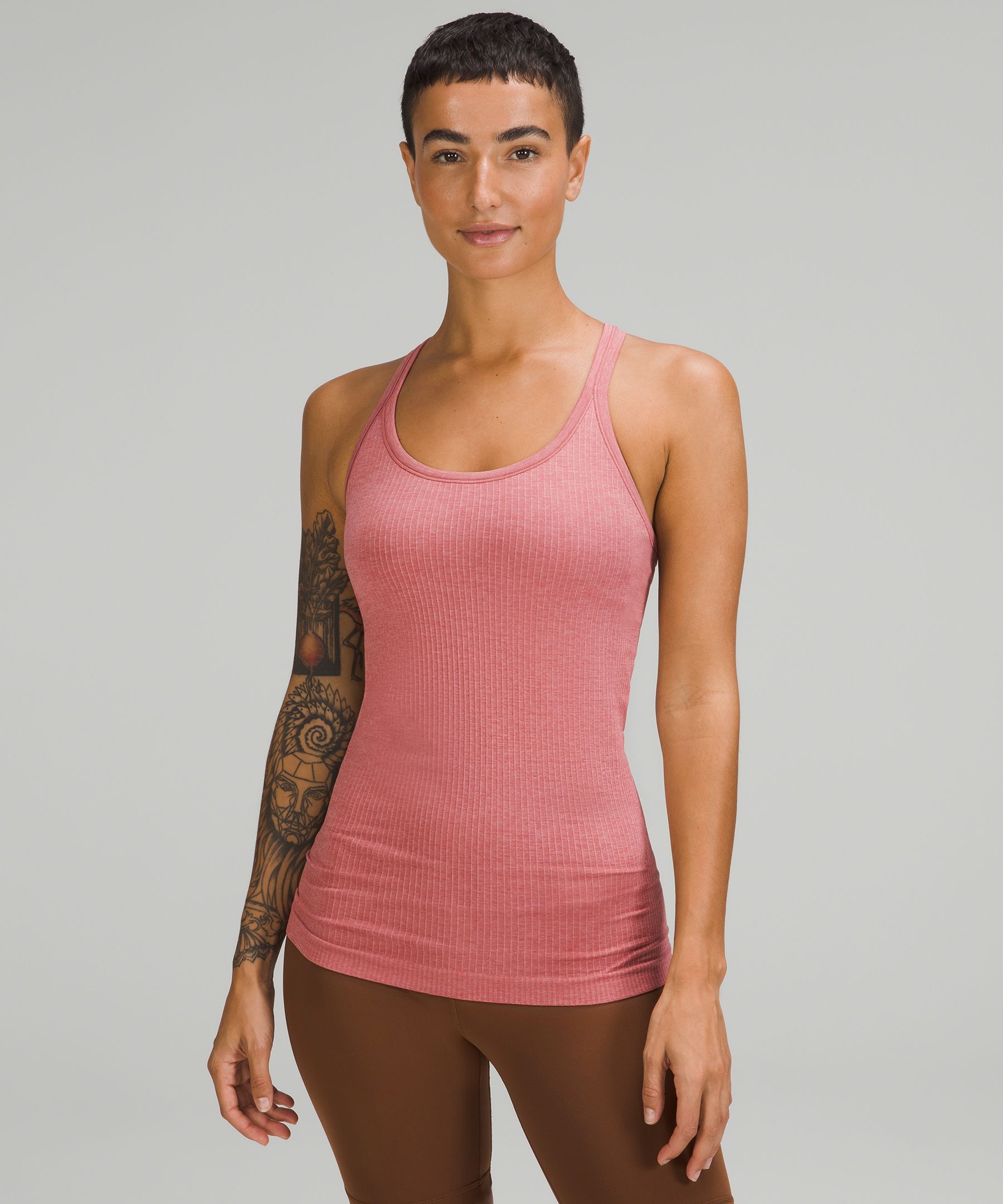 Embrace your movement. This soft tank is powered by seamless construction so you can move freely through your practice and beyond. Designed for Yoga. Intended to provide light support for B/C cups:Slim fit skims your body:Hip length sits below the waistband for moderate, everyday coverage. Built-in shelf bra for added support and coverage. Pockets for optional, removable cups. Bra: 85% Nylon, 15% Elastane. Cup lining: 95% Nylon, 5% Elastane. Body: 100% Nylon.