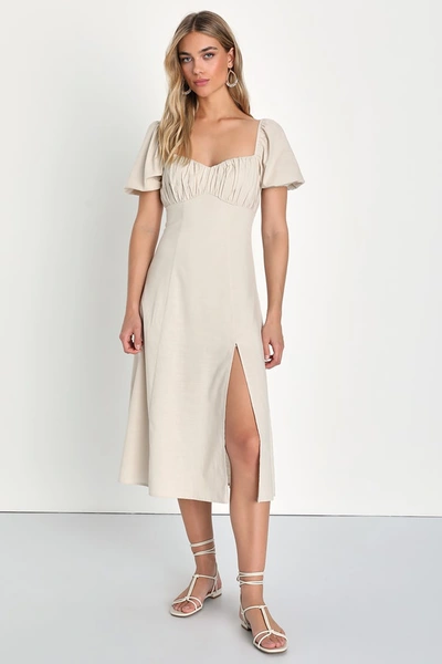 LULUS Endearing Darling Beige Linen Puff Sleeve Midi Dress