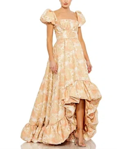 MAC DUGGAL Floral Print Puff Sleeve High Low Brocade Gown In Peach