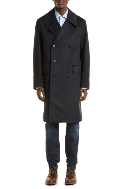 Blue double-breasted coat in wool and cashmere, button closure, front flap pockets, inside pockets.