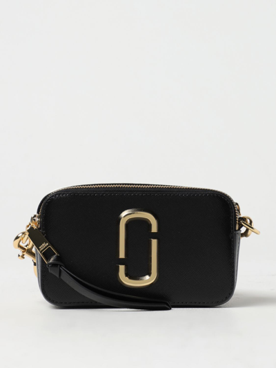 Marc Jacobs The Snapshot shoulder bag in black leather with white details, double zip closure, adjustable and removable shoulder strap in logo fabric, gold metallic logo charm on the front, flat back pocket, inner flat pocket, and two main inner compartments. Composition: 100% Leather