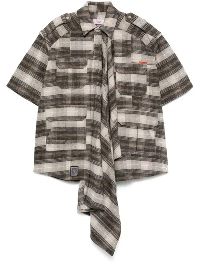 brown/multicolour cotton check pattern front button fastening classic collar epaulettes drop shoulder short sleeves two chest flap pockets two front flap pockets logo patch to the front asymmetric hem