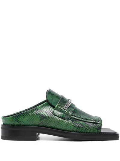 snakeskin-effect leather mules from MARTINE ROSE featuring forest green, black, calf leather, all-over snakeskin print, chain-link detailing, square open toe, slip-on style, branded insole and flat leather sole.