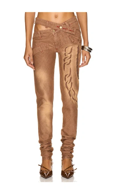 Masha Popova Skinny Bias Cut in Brown. Size S, XS. 50% recycelte Baumwolle, 34% Baumwolle, 16% recycled plastic. Hergestellt in der Ukraine. Maschinenwäsche. Fly zip with button closure. Side seam pocketAdjustable waist straps with button closure. Intentional fading throughout with zip hem. Beinweite am Knie: 36 cm, Beinweite am Abschluss: 30 cm. MPOP-WJ3. MPAW24-405.
