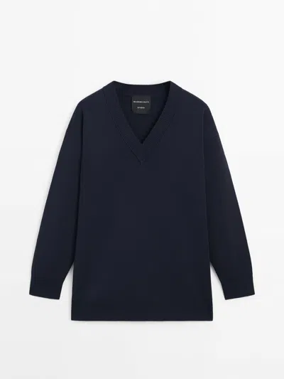 MASSIMO DUTTI Oversize Knit Sweater With V-neck In Navy Blue