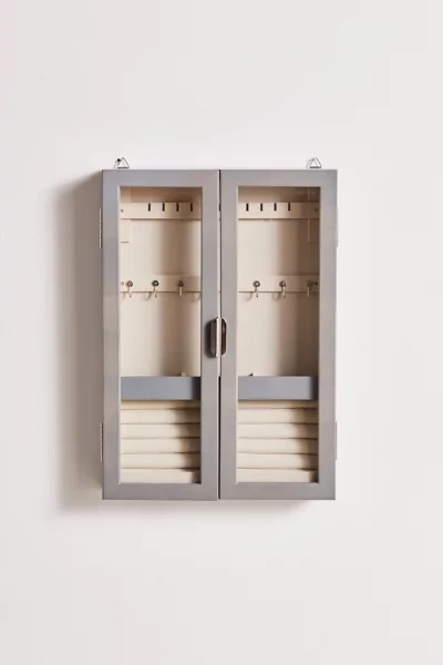 Wall-mounted jewelry display cabinet from Mele & Co. featuring glass doors to show off your favorite necklaces, earrings, rings and more. Wooden framing encases the two-door design. Content + Care. Wood, glass Wipe clean Imported Size. Dimensions: 12"l x 3"w x 17"h