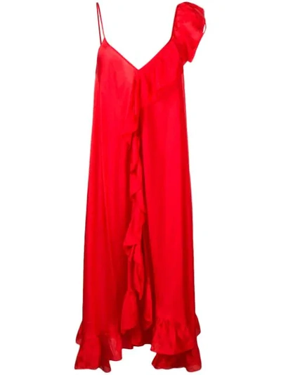 Coral silk Noemie dress from Mes Demoiselles featuring spaghetti straps, a scoop neck, a ruffled design and a one shoulder design.