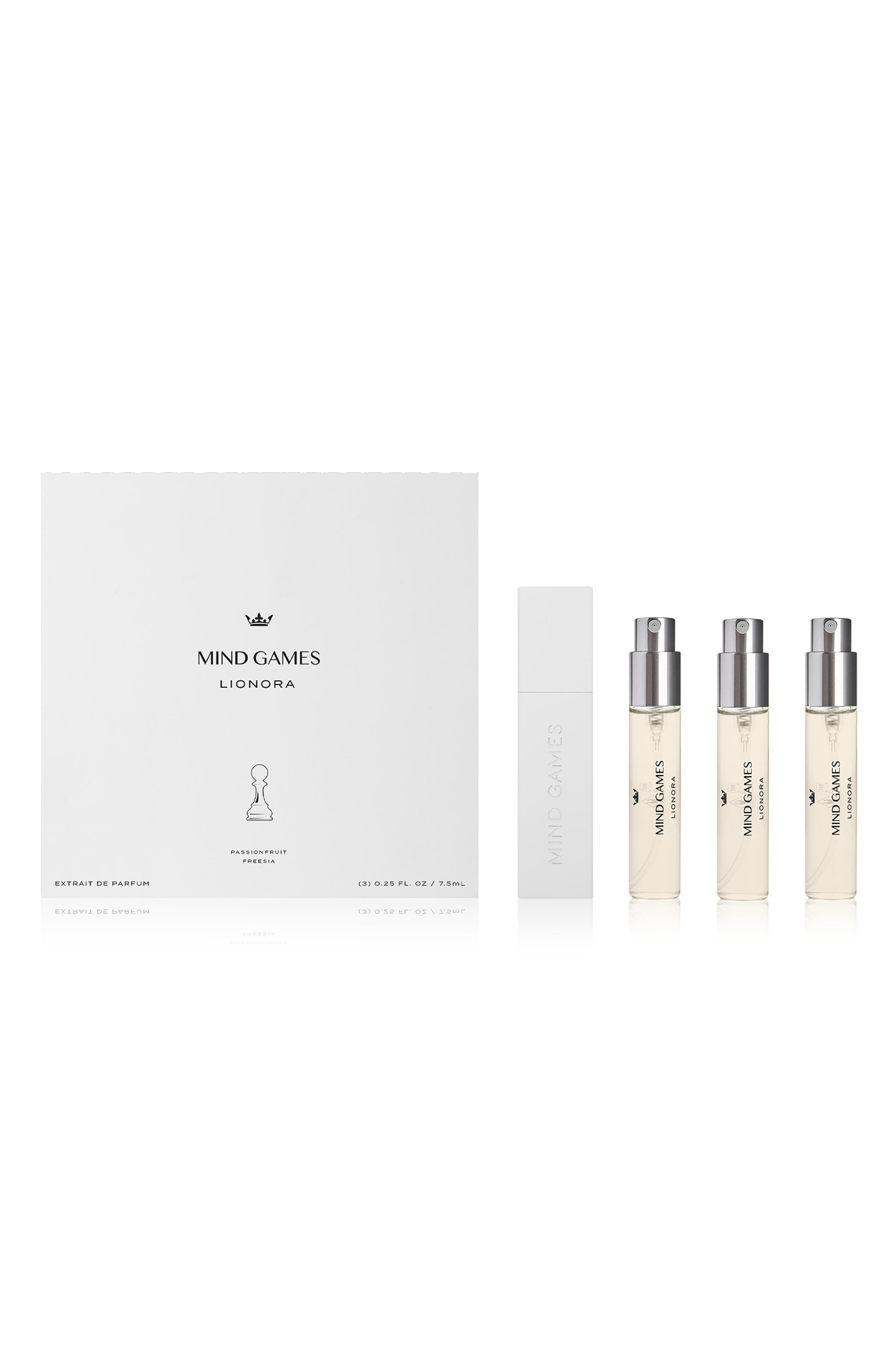 What it is: A set of three travel-sized Lionora Extrait de Parfums from MIND GAMES, plus a luzurious zamak atomizer.Fragrance story: 'The SOULMATE collection invites you to set the tone in powerful and unrivaled fashion with the fullest range of the aromatic experience. Ignite your passion and discover your best self in your SOULMATE. The elusive scent of Lionora celebrates the seductive allure of grace, beauty and wisdom. Indulgent bursts of fruits and florals soak into the honeyed, animalic notes of osmanthus, before melting into the soft and creamy notes of sandalwood. Powerful in its delicacy and completely enchanting, Lionora captures the passion and romance of new love, and the strength and sweetness of true love.'Lionora is meant to immerse the senses in the multidimensional texture of apricot skin and blooming white floralcy. Top notes of ginger Madagascar and passionfruit are encased in the soft heart of freesia and the delicate, blossoming petals of our Osmanthus DeLaire. Creamy, edible sandalwood and tonkalactoneleave a warming, skin-hugging trail that feels effortlessly elegant and timeless.' - Christelle Laprade, PerfumerStyle: Fruity floral.Set includes:- Three travel-size Extrait de Parfums (0.25 oz. each)- Refillable zamack atomizerNotes:- Top: passionfruit, tonka bean, Madagascar ginger- Middle: apricot skin, osmanthus delaire, freesia- Base: sandalwood, tokalactone captive, eco musk Made in the USA