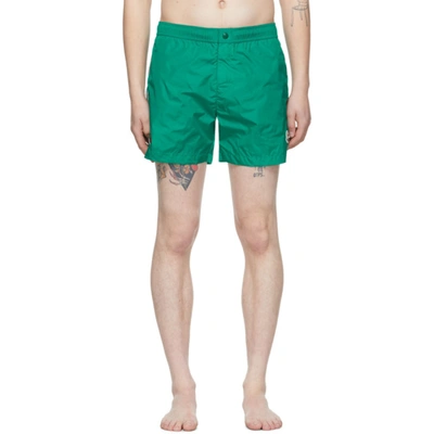 Nylon taffeta swim shorts in green. Mid-rise. Three-pocket styling. Concealed drawstring at waistband. Felted logo patch in off-white, navy, and red at front leg. Grosgrain trim striped in red, off-white, and navy at outseams. Tonal embroidered eyelet vents at back pocket. Velcro-fly. Tonal hardware.Supplier color: Green