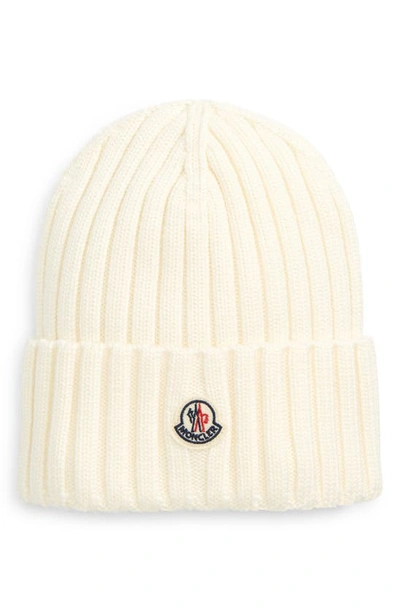 MONCLER Logo Patch Rib Wool Beanie In White