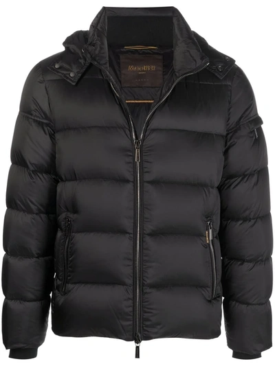 Moorer down jacket in black nylon. Detachable hood with adjustable drawstring. Closed on the neck by visible snap buttons. Front closure with double slider maxi zip. Cuffs and inside collar in soft knit Side welt pockets closed with zip Welt pocket on the arm Adjustable internal drawstring at the bottom Double internal pocket. Filled with goose down. 100% polyamide Made in Italy Composition: Poliammide
