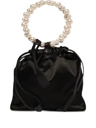 black faux pearl embellished top handle drawstring closure detachable shoulder strap