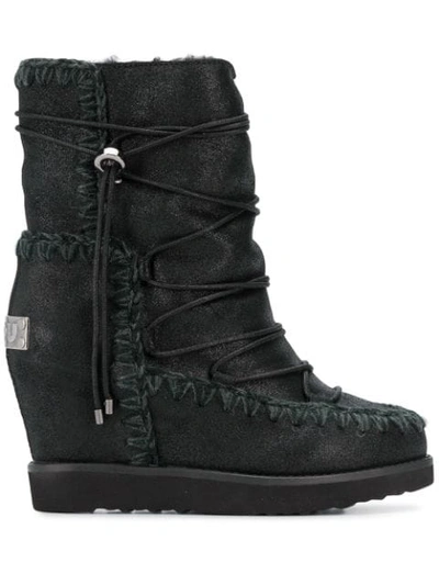 Black leather and rubber Eskimo 18 boots from Mou featuring a round toe, a lace-up front fastening, a pull-on style, a wedge heel, a fur lining and a logo patch at the back . .
