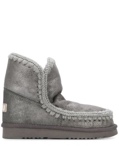 Metallic grey shearling/fabric Eskimo sherling ankle boots from MOU featuring round toe, shearling lining, contrast stitching, logo patch to the rear, flat rubber sole and metallic effect.