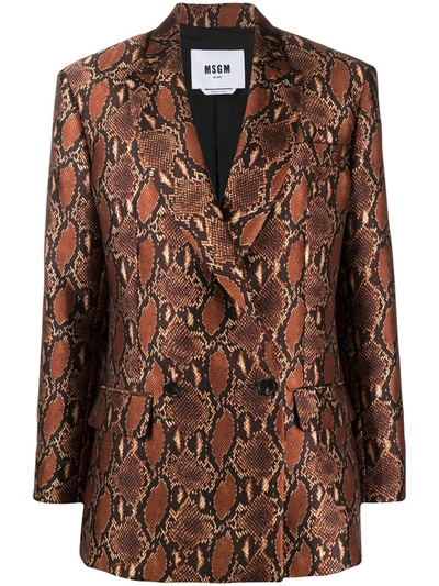 Tonal-brown and black python-print double breasted blazer from MSGM featuring a snakeskin print, peaked lapels, long sleeves, button cuffs, a rear central vent, front flap pockets, a double breasted front fastening and a lining.