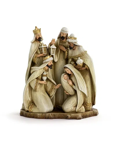 Experience the sacred moment of divine revelation with this stunning figurine depicting the Holy Family and the Three Wise Men, all adorned in pristine white robes. The Three Kings stand in majestic dignity, their regal bearing contrasting beautifully with their posture of reverence. Below them, the Holy Family kneels in humble acknowledgment of the miraculous journey that has brought these noble visitors from distant lands. Joseph's protective presence, Mary's serene devotion, and the infant Jesus's divine innocence create a powerful focal point that draws the eye and touches the heart. Meticulously crafted with attention to every fold of fabric and subtle expression, this figurine will change your home into a sanctuary of contemplation and peacefulness.