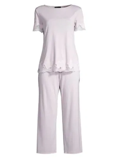 Solid knit pajama top with lace trim detail on cuffs and hem is paired with cropped drawstring pants. Modal/polyester. Machine wash. Imported. SHIRT Scoopneck Short sleeves Pullover style Lace trim PANTS Drawstring waist Pull-on style SIZE & FIT Wide-leg silhouette About 25" from shoulder to hem Inseam, about 26" Model shown is 5'10" (177cm) wearing US size Small. Lingerie - Natori > Saks Fifth Avenue > Barneys. Natori. Color: Heather Silver Pearl. Size: Large.